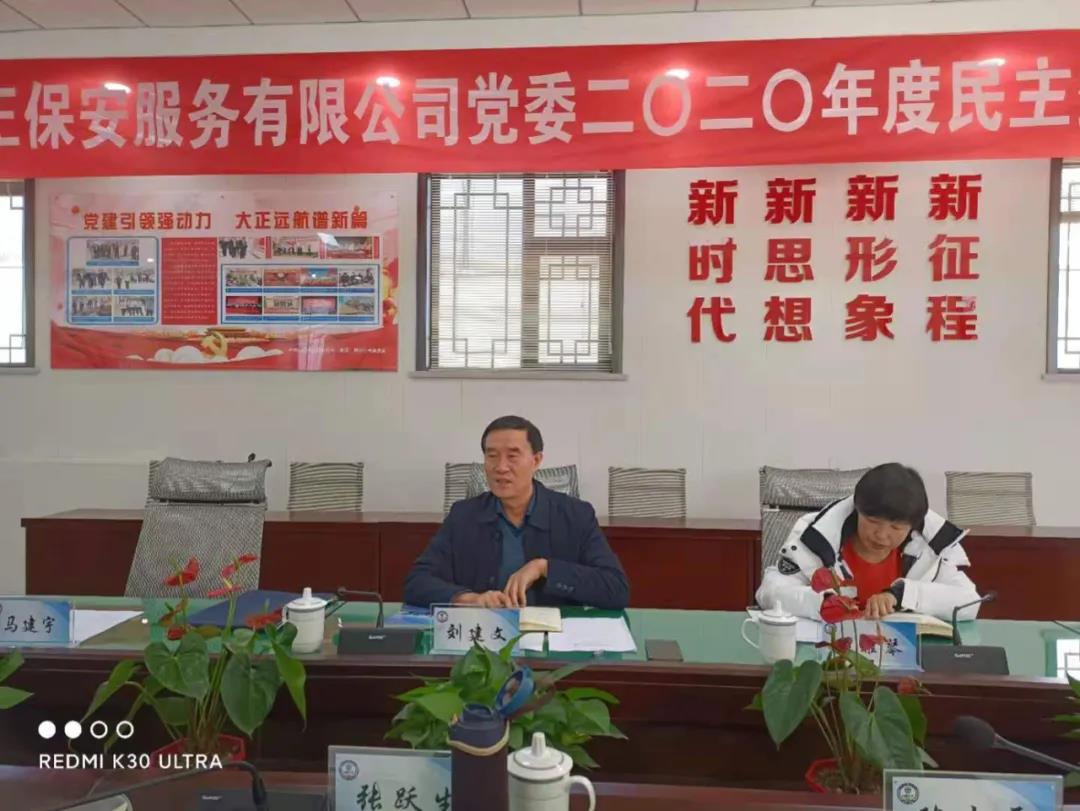 按照市委及市工信局(國資委)黨委安排部署,2021年1月29日下午,山西大正保安服務有限公司黨委召開2020年度黨員領導干部民主生活會。市工信局(國資委)黨委委員、二級調研員劉建文同志等市工信局(國資委)指導組同志到會指導。公司黨委書記、董事長張躍生同志主持會議。公司黨委副書記、總經理趙培宏同志,黨委副書記、副總經理陳志平同志,黨委委員、副總經理王明生同志,黨委委員、總經理助理邢春生同志,董事、副總經理張瑞東同志,董事、財務總監(jiān)呂雙明同志參加會議,辦公室、黨群工作部負責人列席會議。