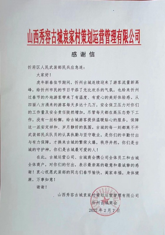 感謝信中,山西秀容古城袁家村策劃運(yùn)營管理有限公司和忻州古城商會(huì)對物業(yè)公司民兵應(yīng)急連在春節(jié)期間面對古城客流量增大,隊(duì)員們堅(jiān)守崗位,圓滿完成安保任務(wù)給與了充分肯定和表示了崇高敬意,并致以衷心感謝和衷心祝愿!