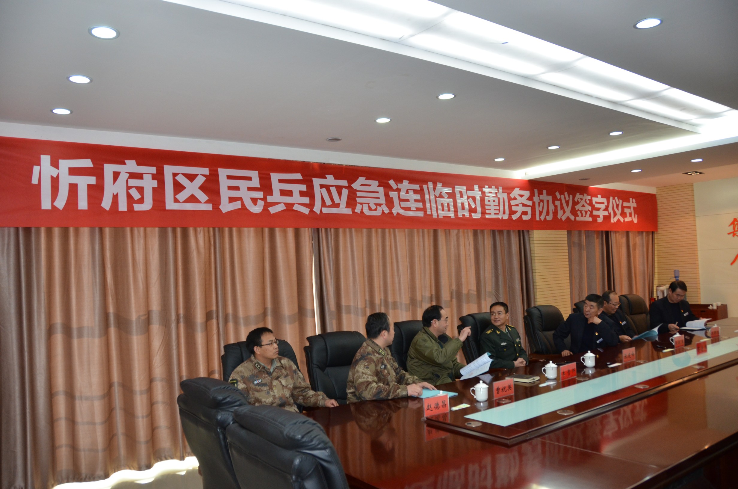 忻府區(qū)人民武裝部部長(zhǎng)張建峰同志召集所屬負(fù)責(zé)人與我公司領(lǐng)導(dǎo)在該部會(huì)議室召開忻府區(qū)民兵應(yīng)急連臨時(shí)勤務(wù)協(xié)議簽字儀式。雙方領(lǐng)導(dǎo)暢談軍旅生涯,暢所欲言,對(duì)合作開展執(zhí)行勤務(wù)事宜進(jìn)行細(xì)致研究,武裝部領(lǐng)導(dǎo)對(duì)我公司的隊(duì)伍建設(shè)作風(fēng)以及企業(yè)服務(wù)精神面貌給與了充分肯定。
