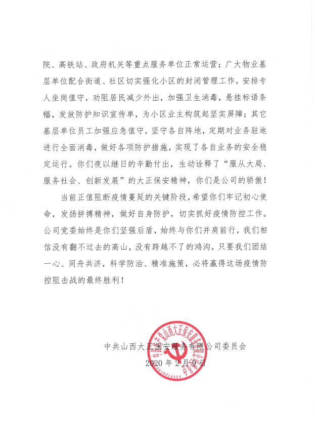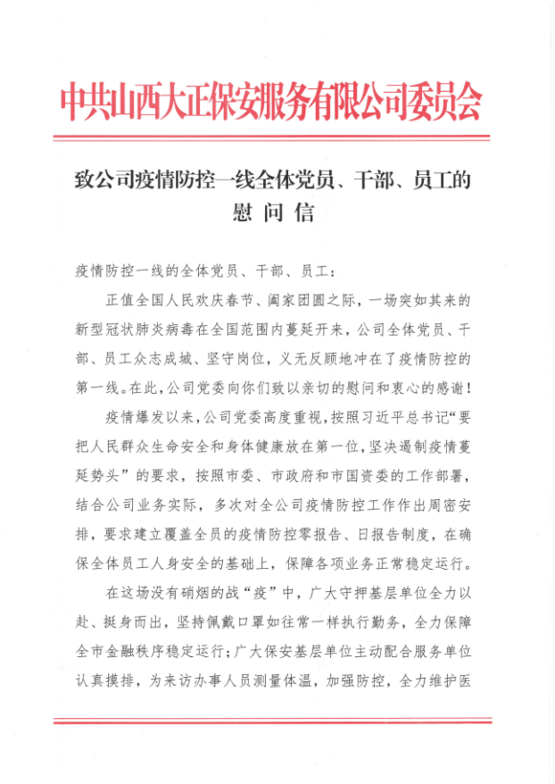 致公司疫情防控一線(xiàn)全體黨員、干部、員工的慰問(wèn)信