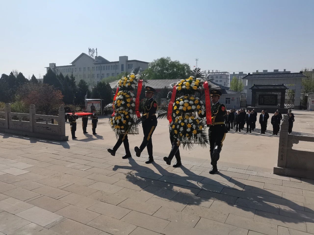 烈士陵園內(nèi)松柏蒼翠,烈士紀(jì)念塔巍然矗立,現(xiàn)場(chǎng)莊嚴(yán)肅穆。上午9時(shí)整,儀式開始,全場(chǎng)齊聲高唱中華人民共和國(guó)國(guó)歌。國(guó)歌唱畢,全場(chǎng)肅立,向烈士默哀。隨后,4名禮兵抬起花籃,正步向前,拾級(jí)而上,將花籃整齊擺放在烈士紀(jì)念塔前,彭原峰同志、趙培宏同志緩步上前,認(rèn)真整理緞帶。花籃的紅色緞帶上“革命烈士永垂不朽”金色大字熠熠生輝,寄托著對(duì)英烈的無限哀思和崇高敬意。之后,全體黨員重溫入黨誓詞,聲音響徹整個(gè)陵園。每一位宣誓的黨員都重新感受入黨時(shí)那神圣的一刻,心中感慨萬分,深切地感受到作為一名共產(chǎn)黨員的自豪與責(zé)任。最后,全體黨員有序參觀革命烈士紀(jì)念墻及紀(jì)念館,通過一張張老照片、一件件陳列展品回顧烈士們的英雄壯舉,追憶革命先輩艱苦卓絕的奮斗歷程。