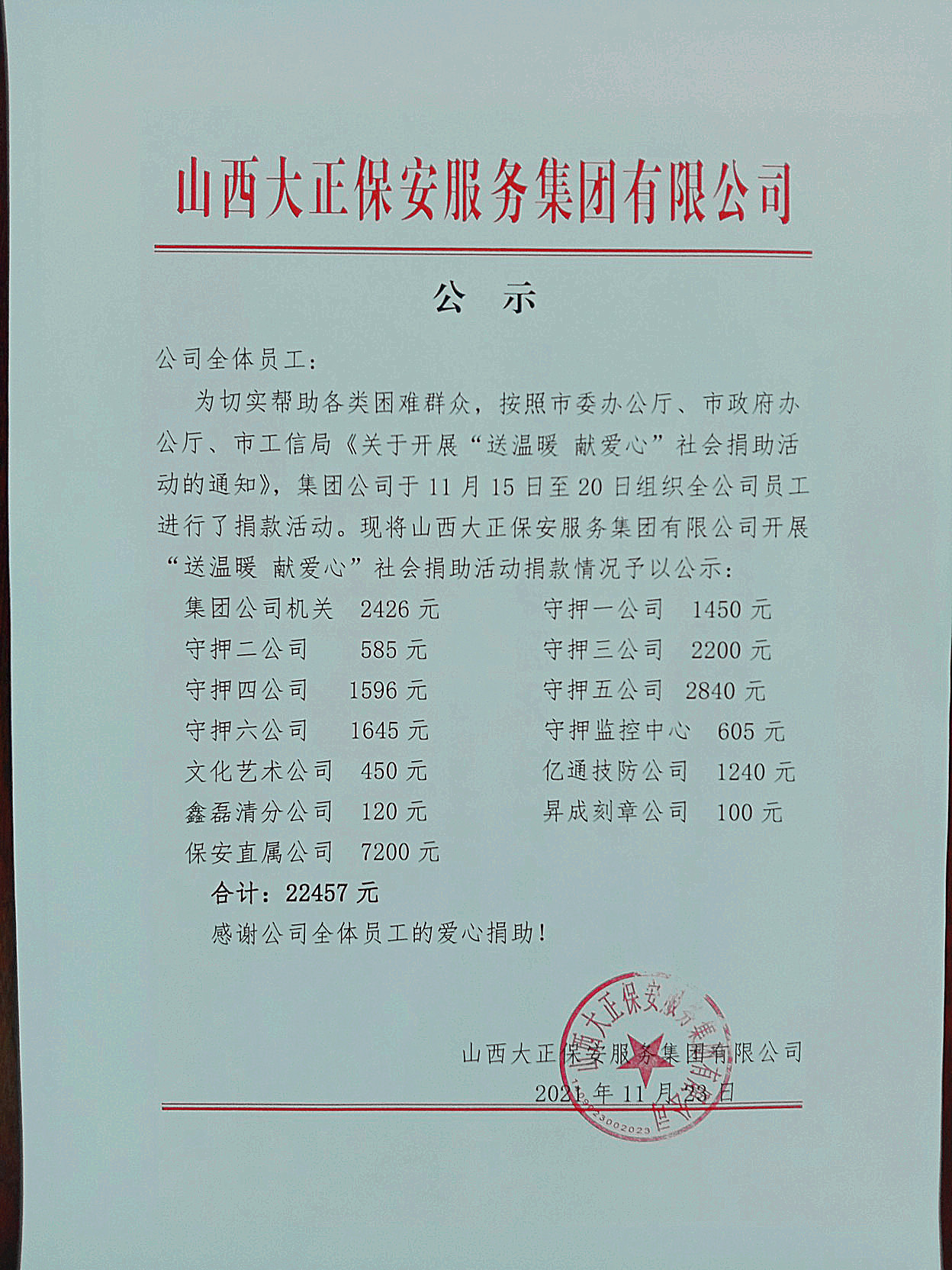 11月15日,集團公司組織領(lǐng)導班子成員及總部駐地全體員工在大會議室參加了社會捐助活動。本次捐助活動,彰顯了山西大正保安集團廣大員工的奉獻擔當精神,也激發(fā)了公司全體員工扶危濟貧的愛心,在全公司上下營造了無私奉獻、助人為樂的濃厚氛圍。