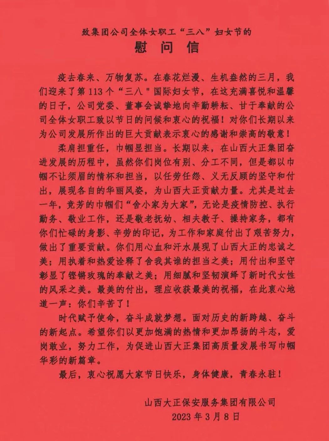 在第113個(gè)國(guó)際婦女節(jié)也是我國(guó)第100個(gè)婦女節(jié)到來(lái)之際,山西大正保安服務(wù)集團(tuán)有限公司向公司所有女同胞們致以節(jié)日的問(wèn)候和美好的祝愿!向所有辛勤耕耘、默默奉獻(xiàn)在大正各個(gè)崗位上的姐妹們表示親切的問(wèn)候、崇高的敬意!