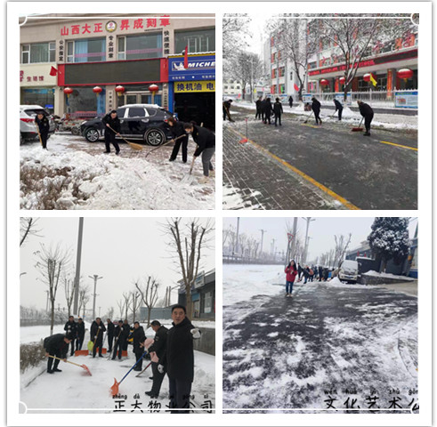 1月5日,2020年紛紛揚揚的一場大雪飄然而至,秀容大地銀裝素裹之間也讓道路覆蓋上了一層厚厚的積雪,不僅給市民出行帶來嚴重不便,也為公司開展工作帶來諸多安全隱患。為此,公司主要領(lǐng)導(dǎo)親自安排,忻州城區(qū)及各縣分支機構(gòu)迅速行動起來清除積雪,及時清掃各自駐地和周邊道路的積雪,用實際行動為我市創(chuàng)文工作做出貢獻。