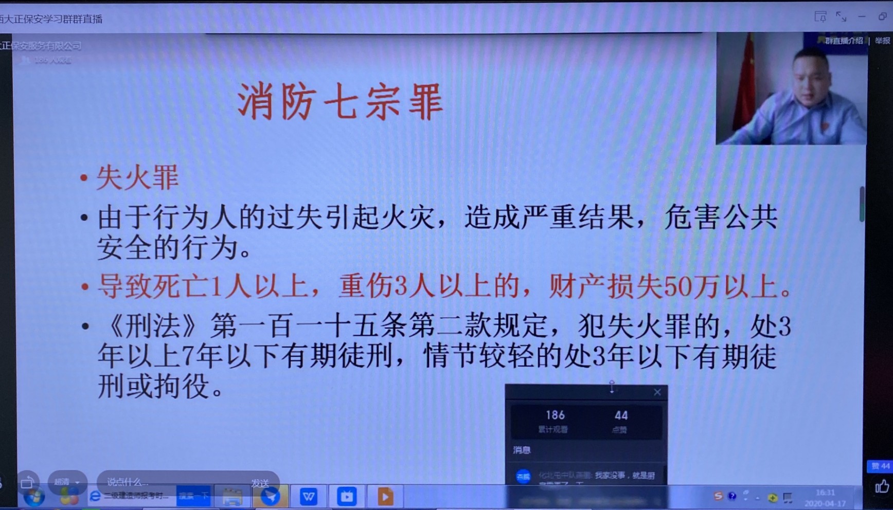 為響應國家號召,貫徹“預防為主,防消結合”的方針,做到科學應對,力求人人講安全,人人會安全。4月17日,公司特邀山西陽光眾安消防科技有限公司忻州分公司講師黃前對我公司員工進行線上安全教學。公司機關干部、全體黨員等200余人參加。