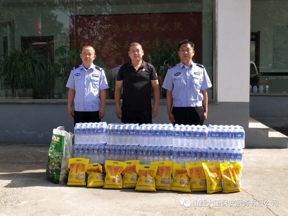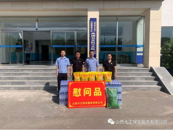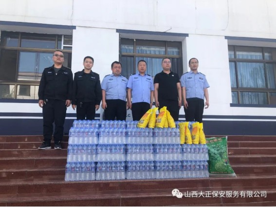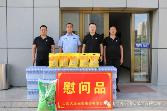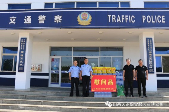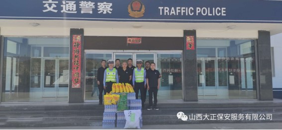 6月1日,山西大正保安服務(wù)(集團(tuán))有限公司守押四分公司軒崗中隊(duì)中隊(duì)長江達(dá),代表公司到原平市公安局交通警察大隊(duì)軒崗交警六中隊(duì),慰問一線執(zhí)勤交警,為烈日下辛苦執(zhí)勤的一線民警送去降溫解暑的飲用水和食物,他們頂烈日,冒酷暑,吃苦耐勞,全心全意為人民服務(wù)。呼吁全體人員向交警學(xué)習(xí),牢固樹立交通安全意識,支持交警工作,做遵守交通法規(guī)的遵守者和守護(hù)者。