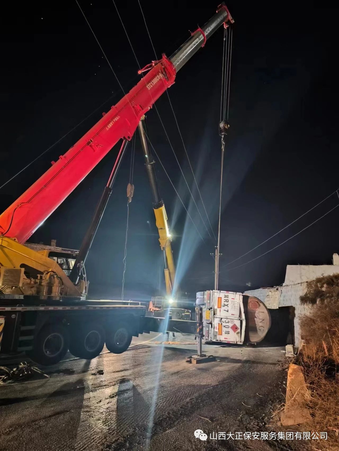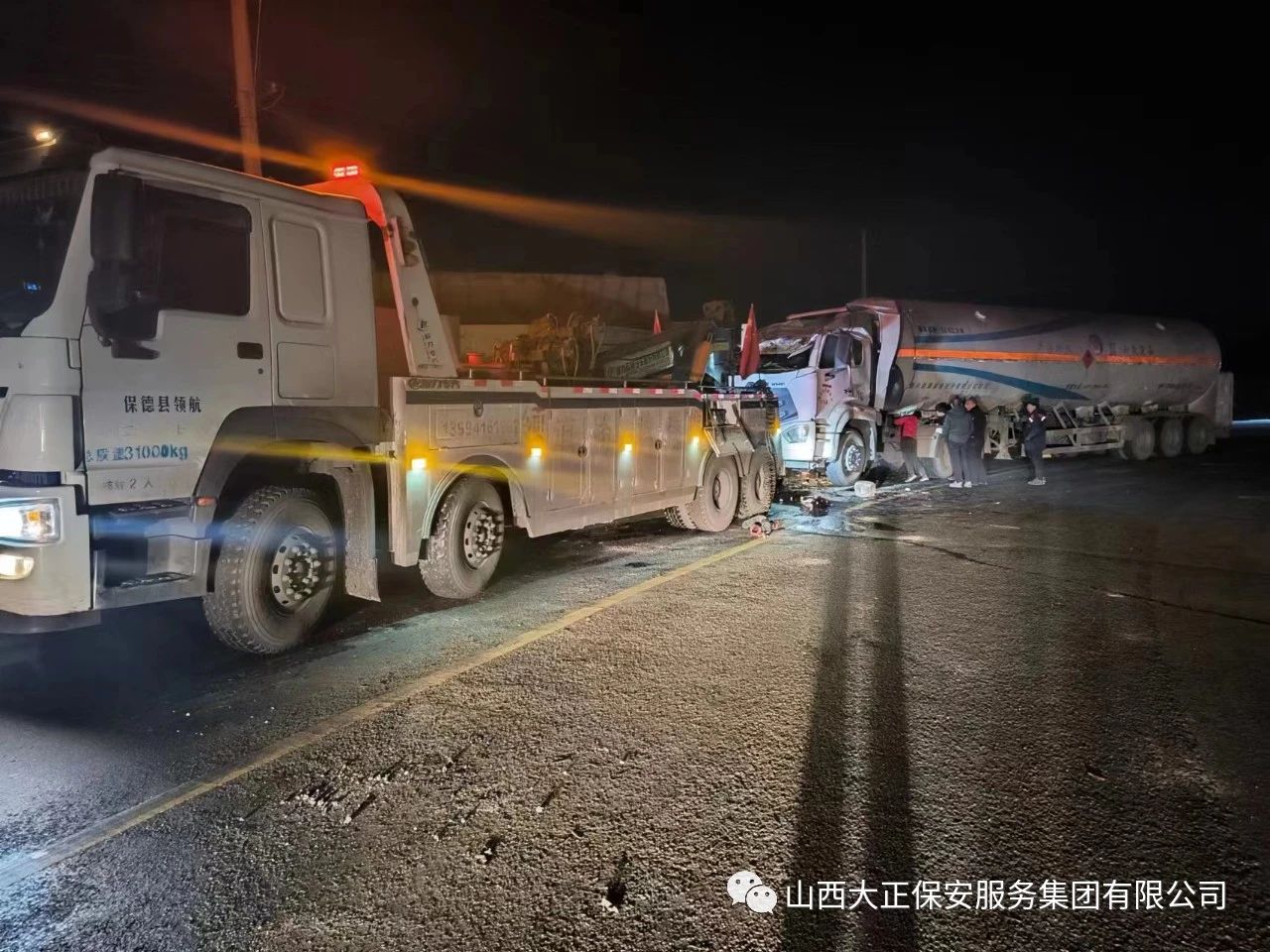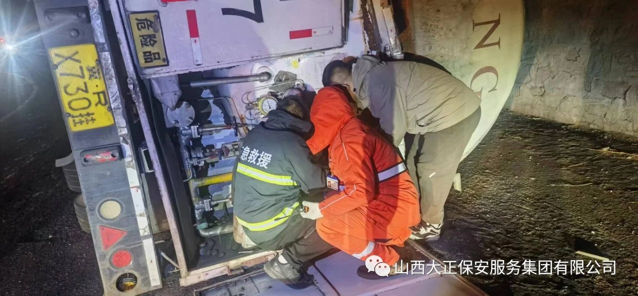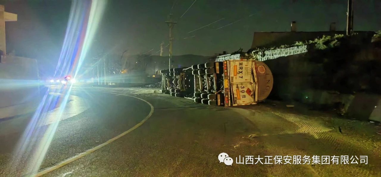 2023年11月23日晚8時(shí),山西大正保安集團(tuán)公司保德縣守押中隊(duì)?wèi)?yīng)急救援大隊(duì)接到應(yīng)急局出勤指令,棗林坡有滿載液化氣罐車發(fā)生側(cè)翻,需要派出應(yīng)急人員控制現(xiàn)場(chǎng),并協(xié)助處理側(cè)翻事故。應(yīng)急救援大隊(duì)接到命令后,派出應(yīng)急車輛兩部及應(yīng)急人員5人趕赴現(xiàn)場(chǎng),協(xié)助交警對(duì)現(xiàn)場(chǎng)路段進(jìn)行管控,保證周圍車輛人員安全。
