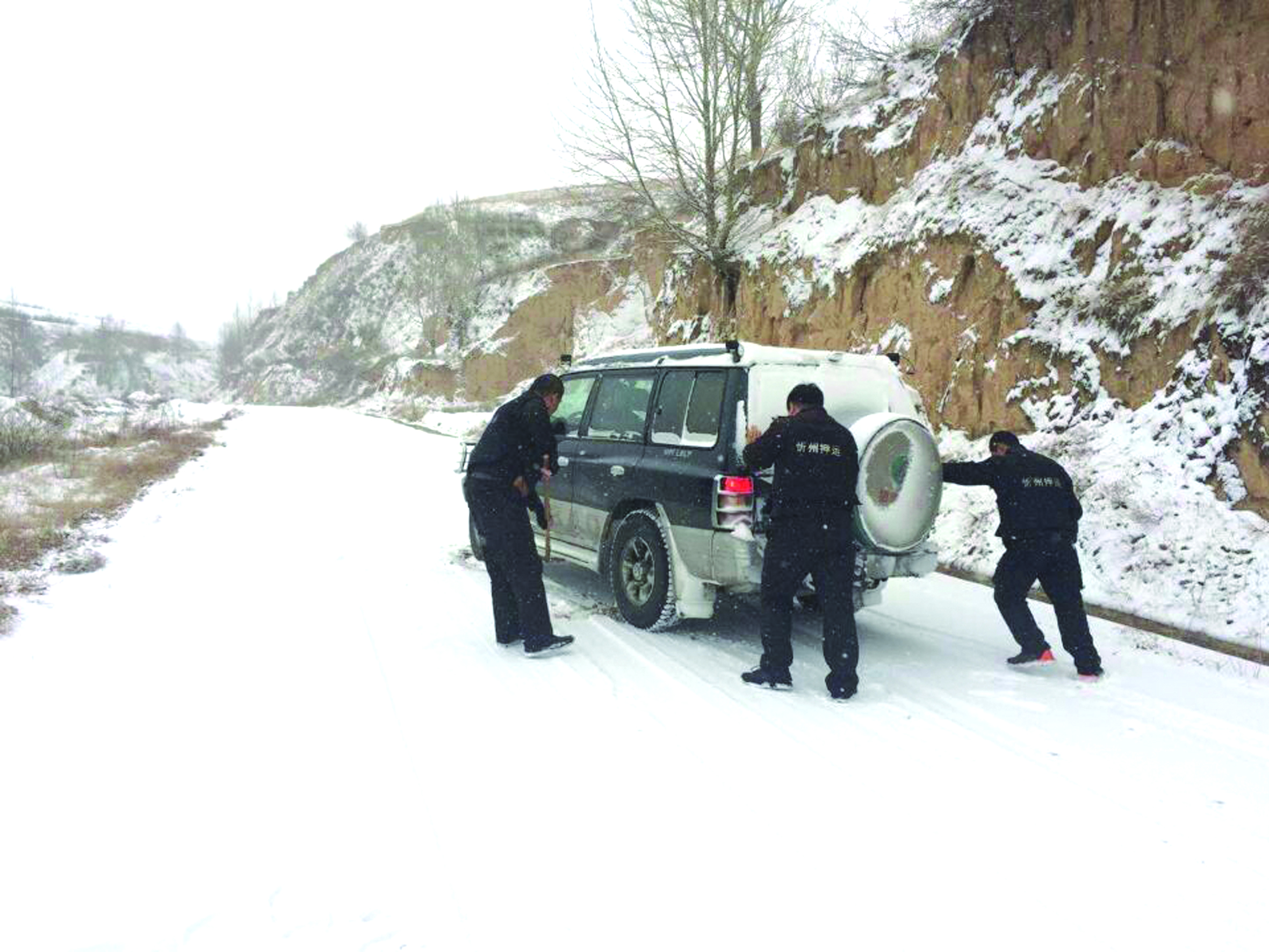 吃過早飯后,整理好裝備準備出車,隊長點名開會,會上強調(diào)雪天注意行車安全,制定了應急預案,并隨車配發(fā)了路上用的鏟雪用具,出現(xiàn)情況隨時逐級匯報。