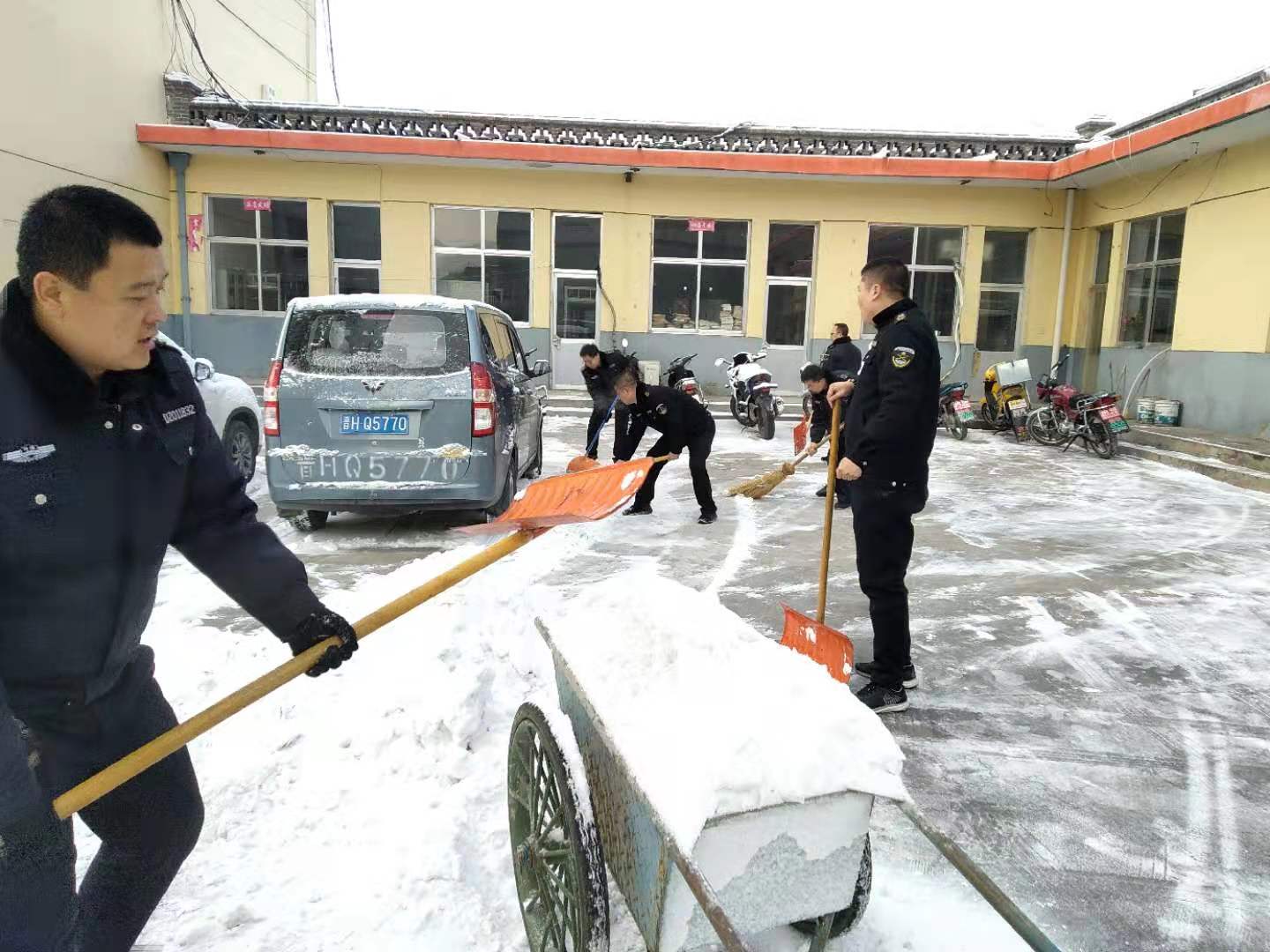 30日一大早,中隊組織隊員積極投身到掃雪行動中。雖然室外氣溫很低,許多人的手和臉也被凍得通紅,然而,這一切絲毫沒有影響大家的勞動熱情和效率。隊員們團結(jié)協(xié)作、井然有序,揮舞著鐵鍬和笤帚,鏟的鏟、掃的掃,干得熱火朝天,形成了一道美麗的風(fēng)景線!經(jīng)過大家的兩個多小時的努力,中隊主要入口、主干道等處積雪被全部鏟除、掃凈,確保了中隊道路通暢,為中隊安全生產(chǎn)和隊員出行掃除了障礙。